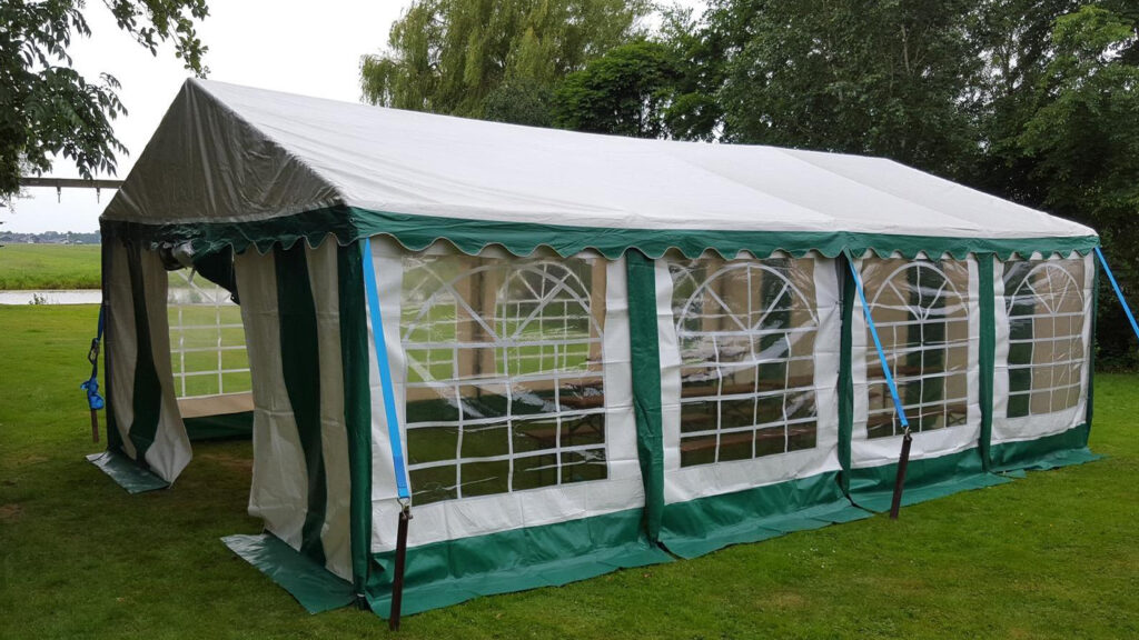 Er zijn 2 type tenten beschikbaar, één van 6m bij 8m en één van 6m bij 10m.